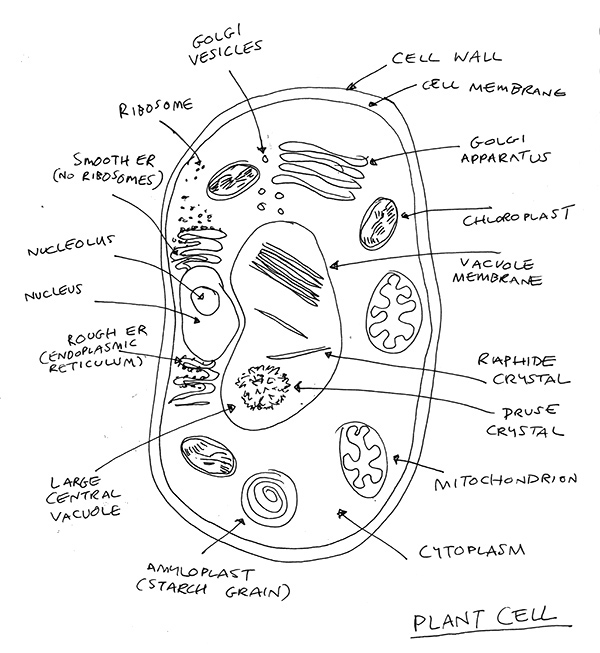 What a beautiful thing a plant cell is. There are hundreds of thousands of these in each leaf. It has a cell wall around it, made of cellulose. This is very different from animal cells which don’t have a cell wall, just a membrane. Plant cells have a membrane too, but the cell walls are important. They give the cells strength and ultimately make trees, and wood, the strong material that it is.