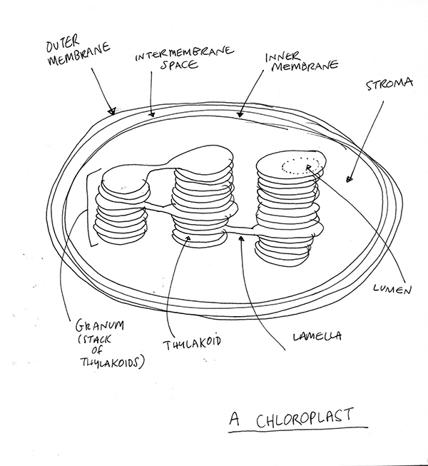 The chloroplast is where it all happens. It’s an organelle within the plant cell. It has its own membrane and can move around inside a cell according to light intensity and direction. It has a liquid inside called the stroma. Within the stroma are tiny structures called granums which are actually stacks of pancake-looking things called thylakoids. These stacks are connected by ‘walkways’ called lamella. It all looks like a futuristic city of some kind.