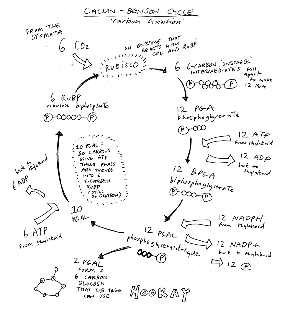 I’ll first quote Oliver Morton’s summary from his book, ‘Eating The Sun: How Plants Power the Planet’: “The key reaction in this cycle is the reaction of carbon dioxide with ribulose biphosphate (RuBP), a sugar molecule containing five carbon atoms, to produce two molecules of phosphoglycerate (PGA); this is the reaction catalysed by the enzyme rubisco. Three such reactions produce six molecules of PGA. The other enzymes involved in the cycle can, if supplied with energy from ATP and NADPH, turn five of these three-carbon sugars into three molecules of the original five-carbon sugar ribulose biphosphate. The sixth three-carbon sugar is ‘profit’ that can be channelled off to the rest of the cell’s metabolism, or stored as starch.”
